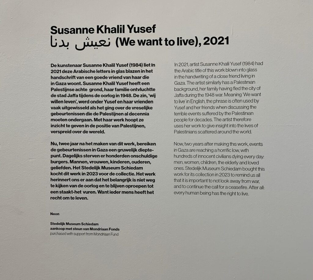 In het Stedelijk Museum in Schiedam is van 14 november 2026 t/m 30 mei 2027 de tentoonstelling te zien van de Palestijnse kunstenaar Susanne Khalil Yusef. Haar familie is gevlucht uit Jaffa in 1948, tijdens de Nakba. Om deze expositie vorm te geven, heeft zij samen gewerkt met de lokale Palestijnse gemeenschap. Momenteel hangt er al een indrukwekkend kunstwerk van haar in het museum: een glas geblazen zin in het Arabisch, die “Wij willen leven” betekent.